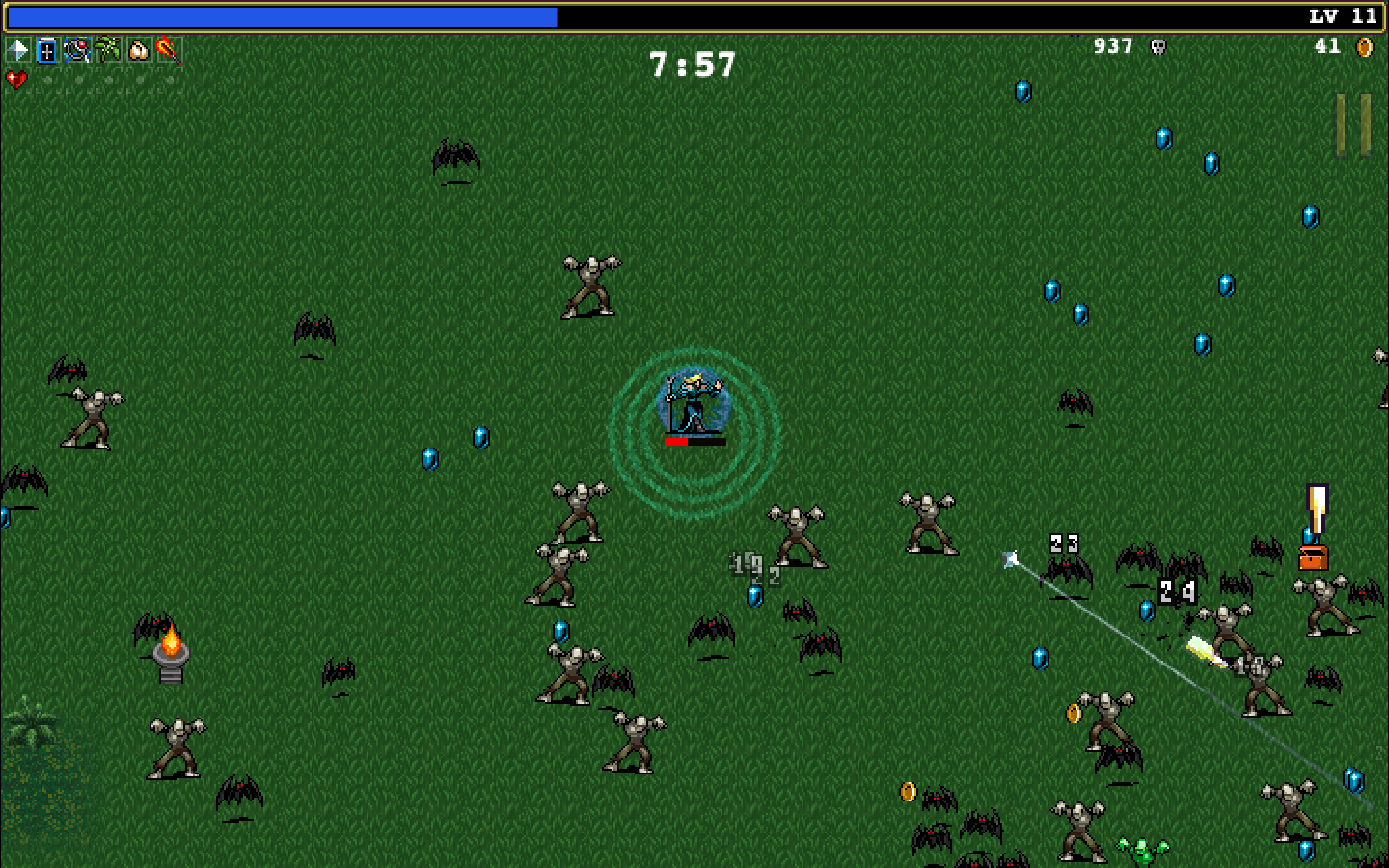 El nuevo juego de moda es Vampire Survivors, una especie de rogue-like donde tu personaje pelea contra incontables monstruos. Las armas se disparan solas, así que tu único objetivo es recuperar las gemas azules (XP) que obtienes al matar los monstruos y así poder subir de nivel y mejorar tus armas. Excelente para partidas cortas, ya que la dificultad va subiendo dependiendo de tus capacidades y de tus armas. En general un juego muy divertido y entretenido que te deja con ganas de seguir jugando otro ratito y otro ratito.