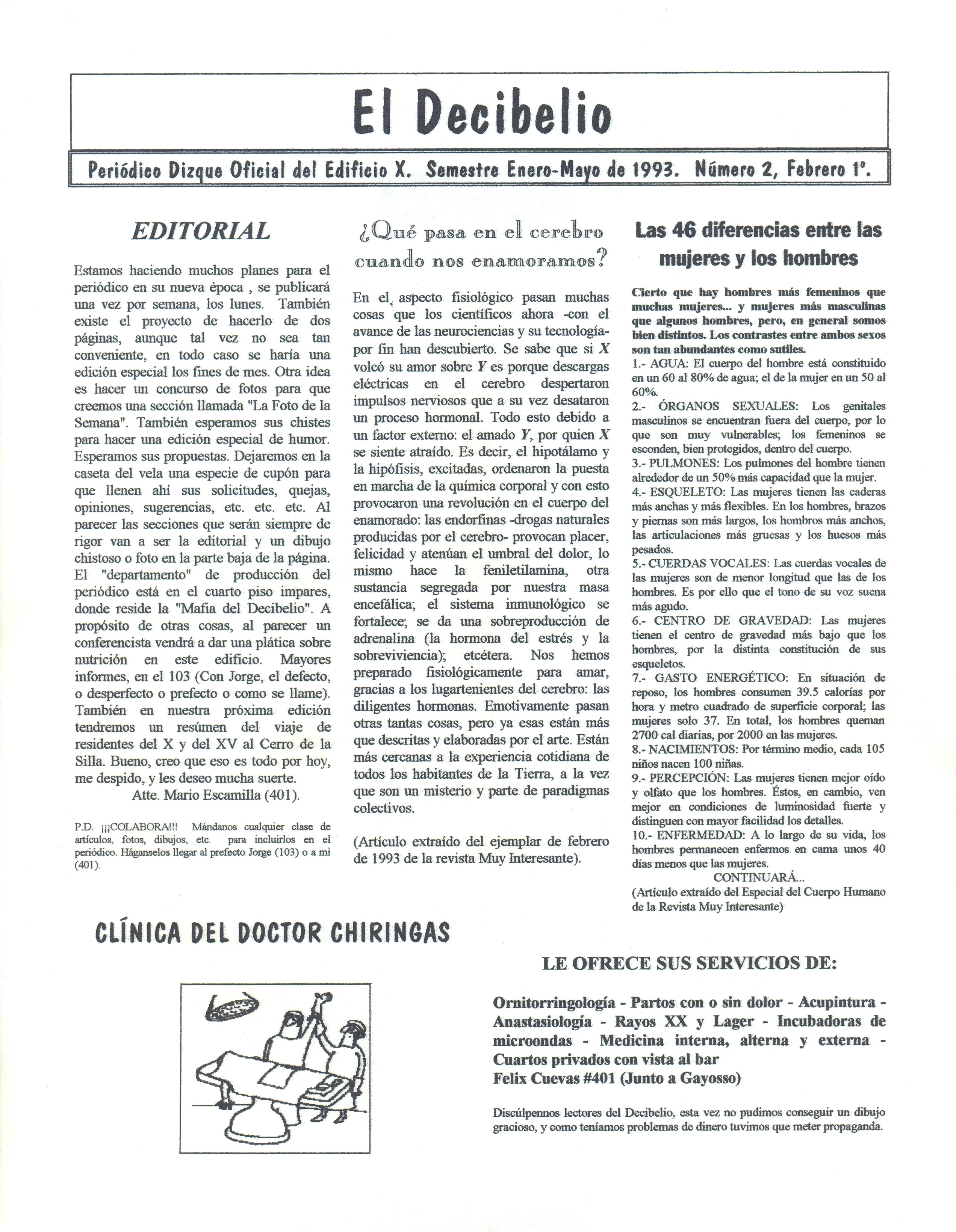 El Decibelio #2 El segundo número, de febrero 1993, es más sencillo temáticamente. Apenas comenzábamos a agarrar callo. Un artículo temático de la revista Muy Interesante se dividió en cuatro partes. El DecibelioEspañol